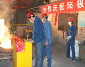2012年7月7日上午11點(diǎn)零19分,青海物產(chǎn)工業(yè)投資有限公司10萬噸電解鋁/年升級改造項目,簡易陽極組裝車間大門前鞭炮齊鳴。青海物產(chǎn)工業(yè)投資有限公司黨總支副書記、青海長春炭素有限公司總經(jīng)理王松華,公司常務(wù)副總經(jīng)理、項目副總指揮常海寧,工業(yè)投資和長春炭素公司副總經(jīng)理姜紅萍,公司副總經(jīng)理張秉瑜,總經(jīng)理助理范登福等公司領(lǐng)導(dǎo)和各車間、部室的職工出席了簡單的點(diǎn)火澆鑄儀式。王松華同志按下了點(diǎn)火按鈕鄭重宣布澆鑄正式開始。當(dāng)中頻爐工將第一爐鐵水倒入抬包時,標(biāo)志著新陽極組裝車間正式投產(chǎn)運(yùn)行。